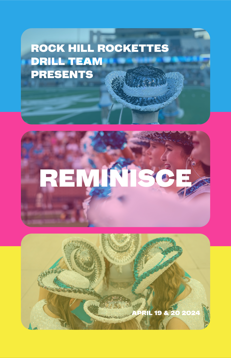 In the fall of 2023, my wife Mallory became the Drill Team Director at Rock Hill High School in Prosper, TX. Reminisce was our first spring show with the Rockettes Drill Team. Featuring vibrant colors layered on top of great photos from the year, the visual design for this show featured a primary CMY(K) color system, and was designed as a system to support the extensive use of a variety of photos from the fall football season. Video screens in the lobby of the auditorium of the show ran a loop of photos with "Reminisce" layered on top, along with a blue, pink, or yellow color overlay. The lobby presented new opportunities to design new things, including signage, additional poster treatments, and personalized scaled down versions of the poster for each team student featuring three photos of them.